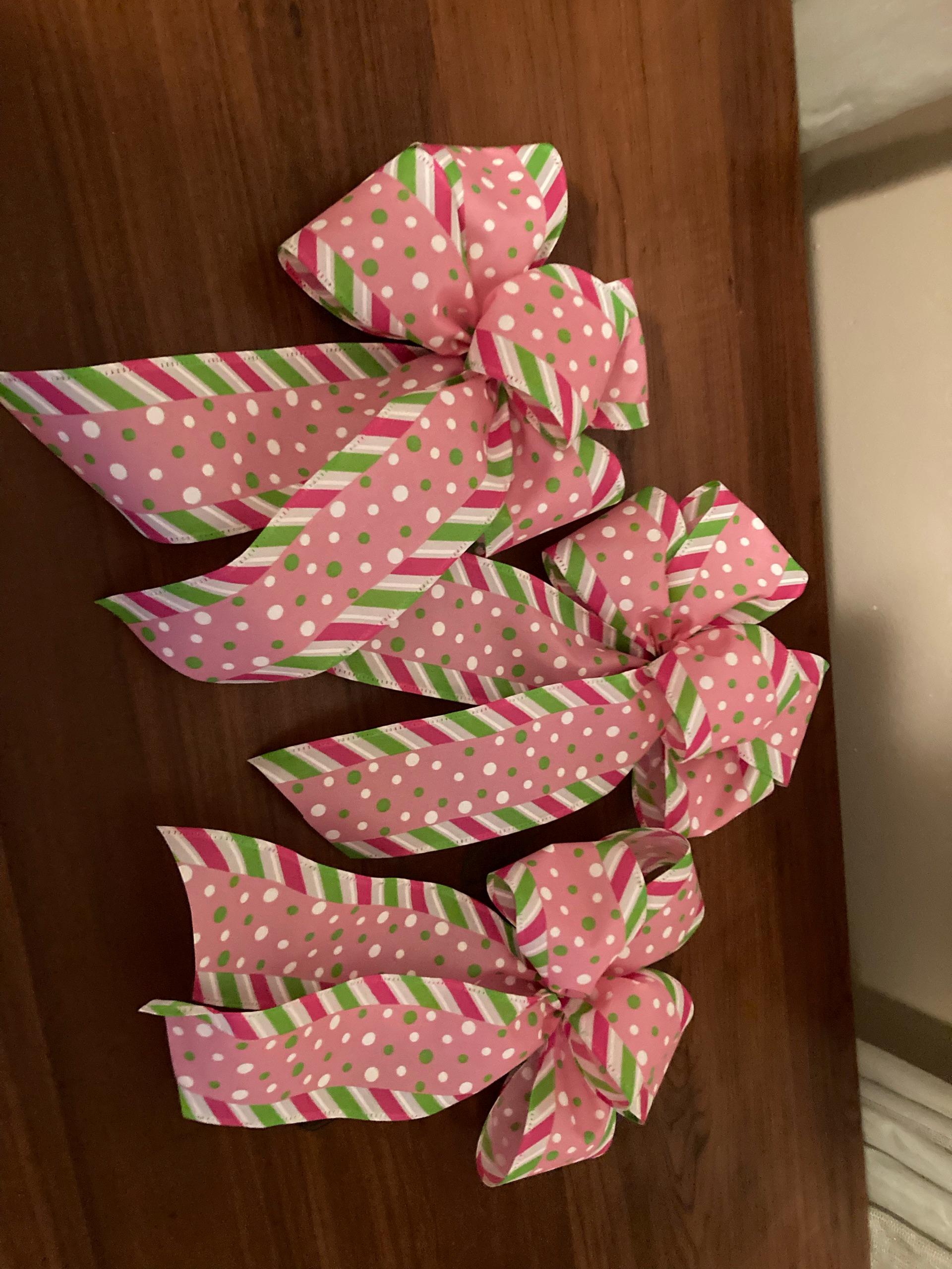 Made with 9 loops using 3 yards of 2.5”wide ribbon;
