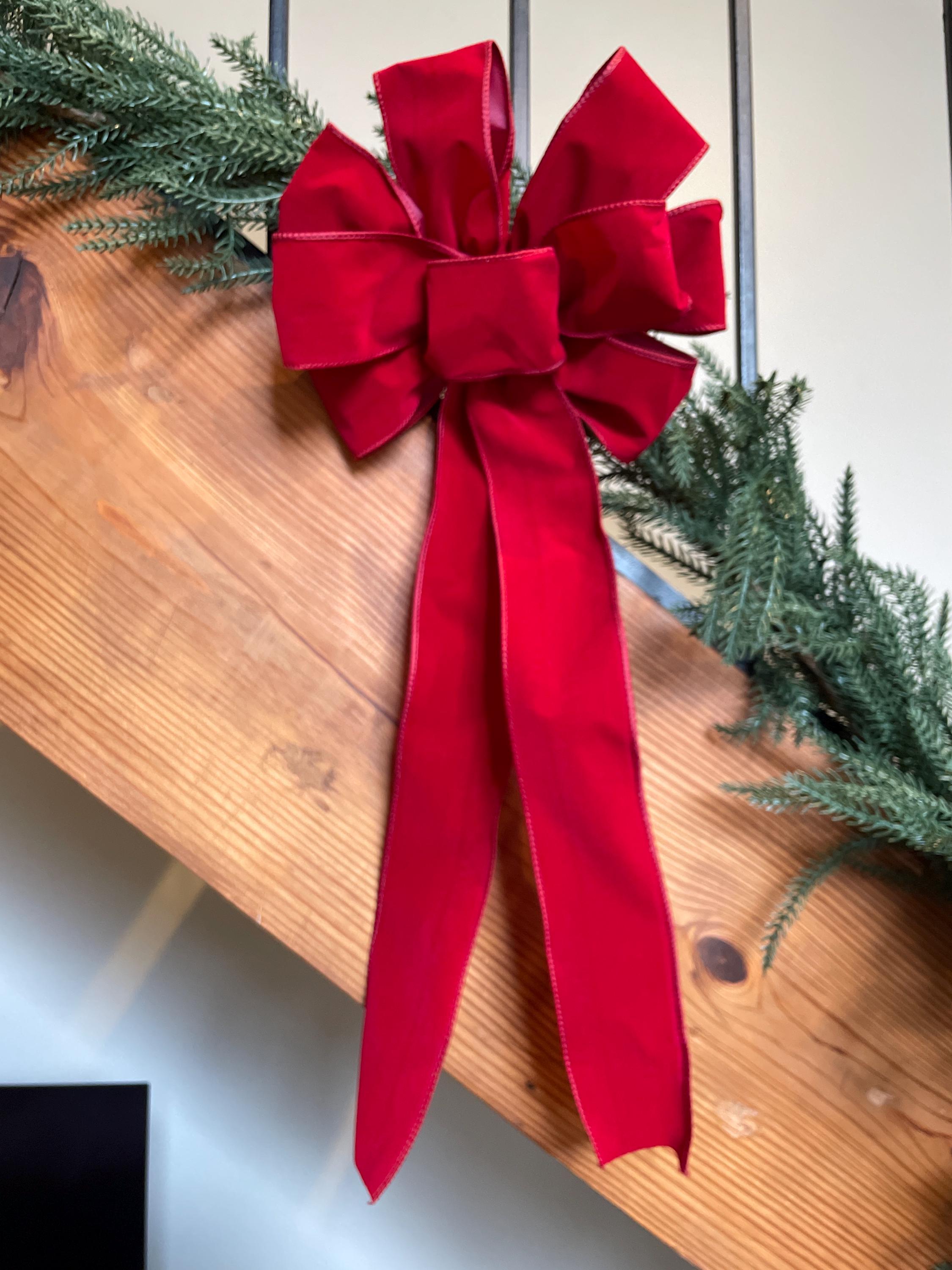 Most of the bows we sell are made from wire-edged ribbon. The wired ribbon allows the bows to more easily hold their shape and to be re-shaped if needed after shipping, storage or adverse weather conditions. However, some velvet Christmas ribbon is made from a stiff polypropylene ribbon that does not have a wired edge. This ribbon does very well outdoors but cannot be reshaped as nicely as the similar (but slightly more expensive) wired ribbon.