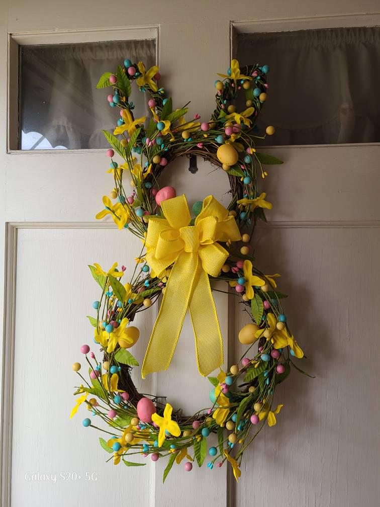 This hand-made bow ideal for decorating for Easter and Spring. This bow measures about 5-6" across and about 10-11" from top to the bottom of the tail. They are made using approx. 2 yards of 1.375" wide ribbon (#9) and have 9 loops. They are the perfect size for most smaller wreaths, swags, door decorations, fences, etc.